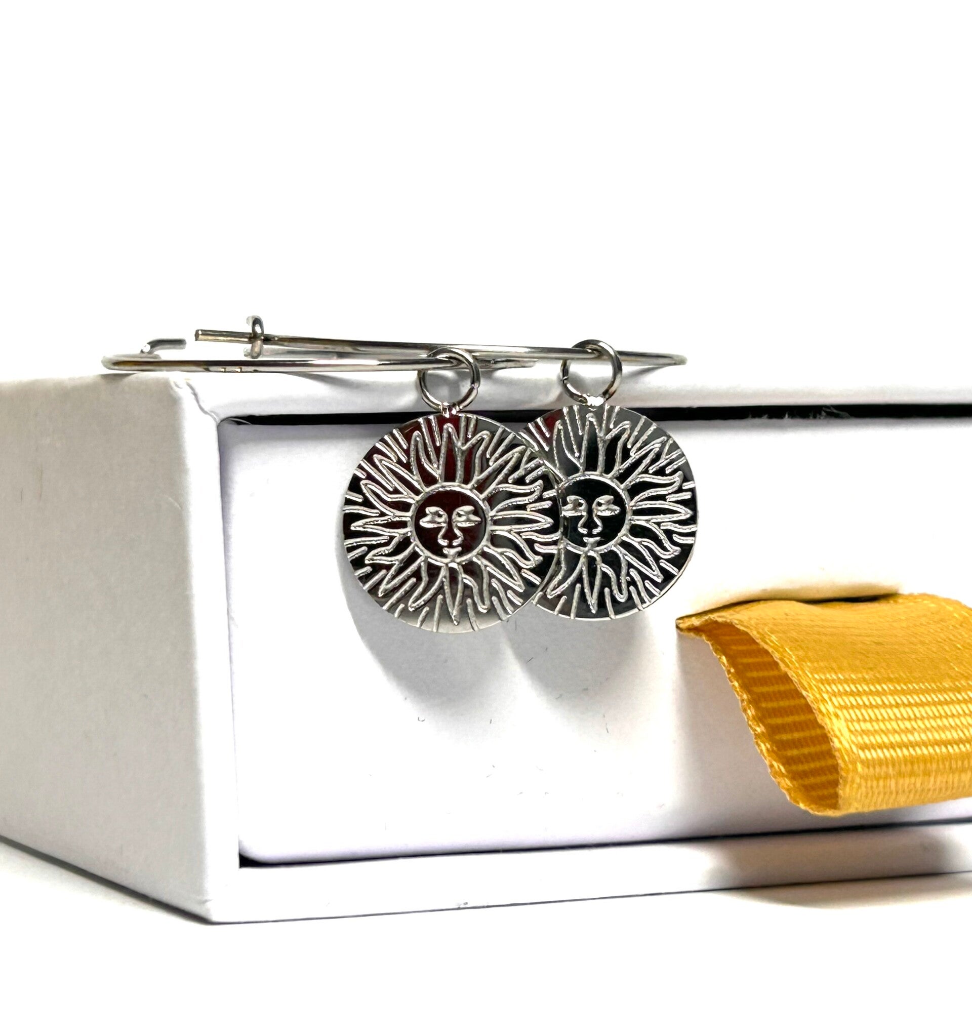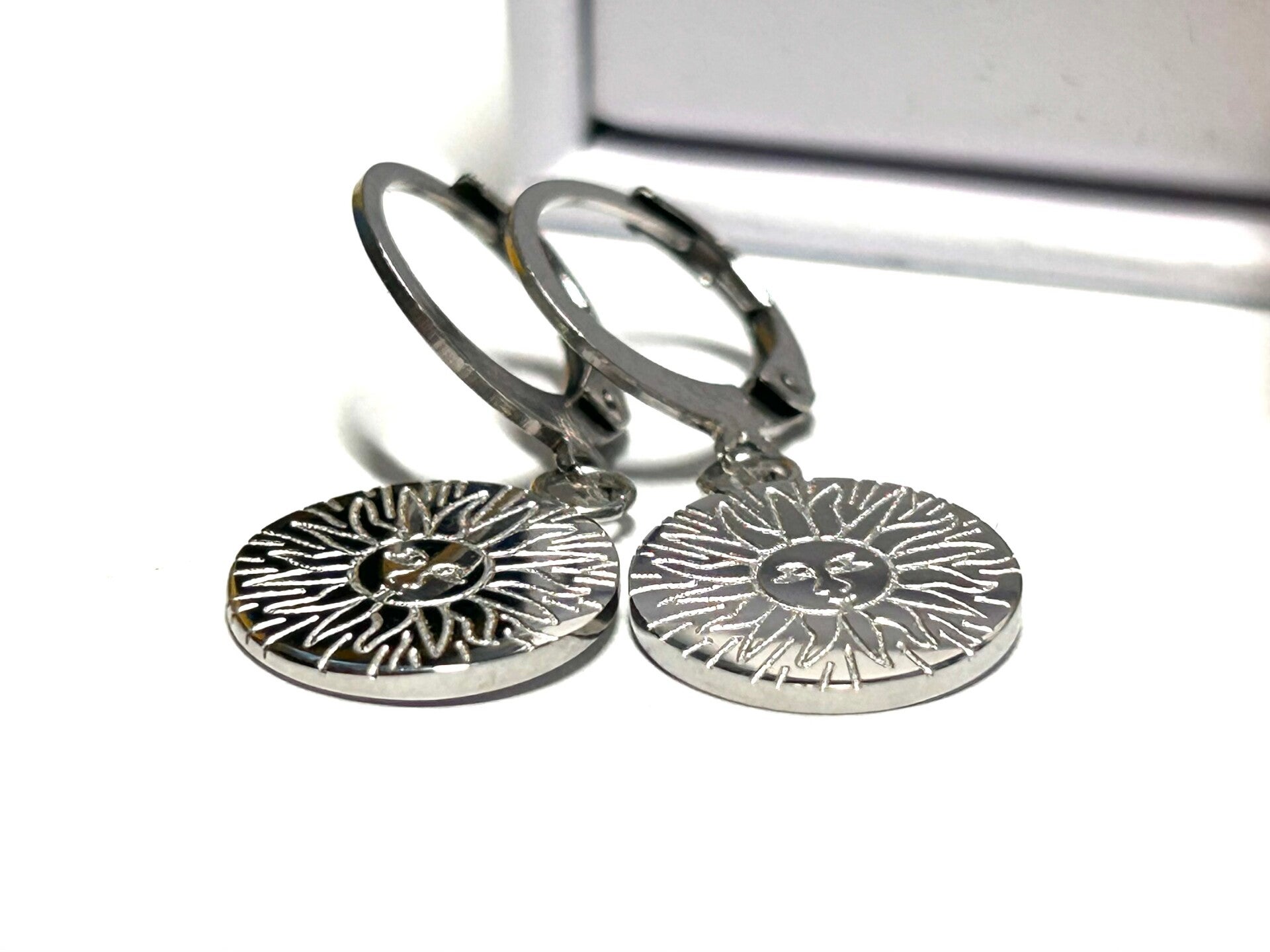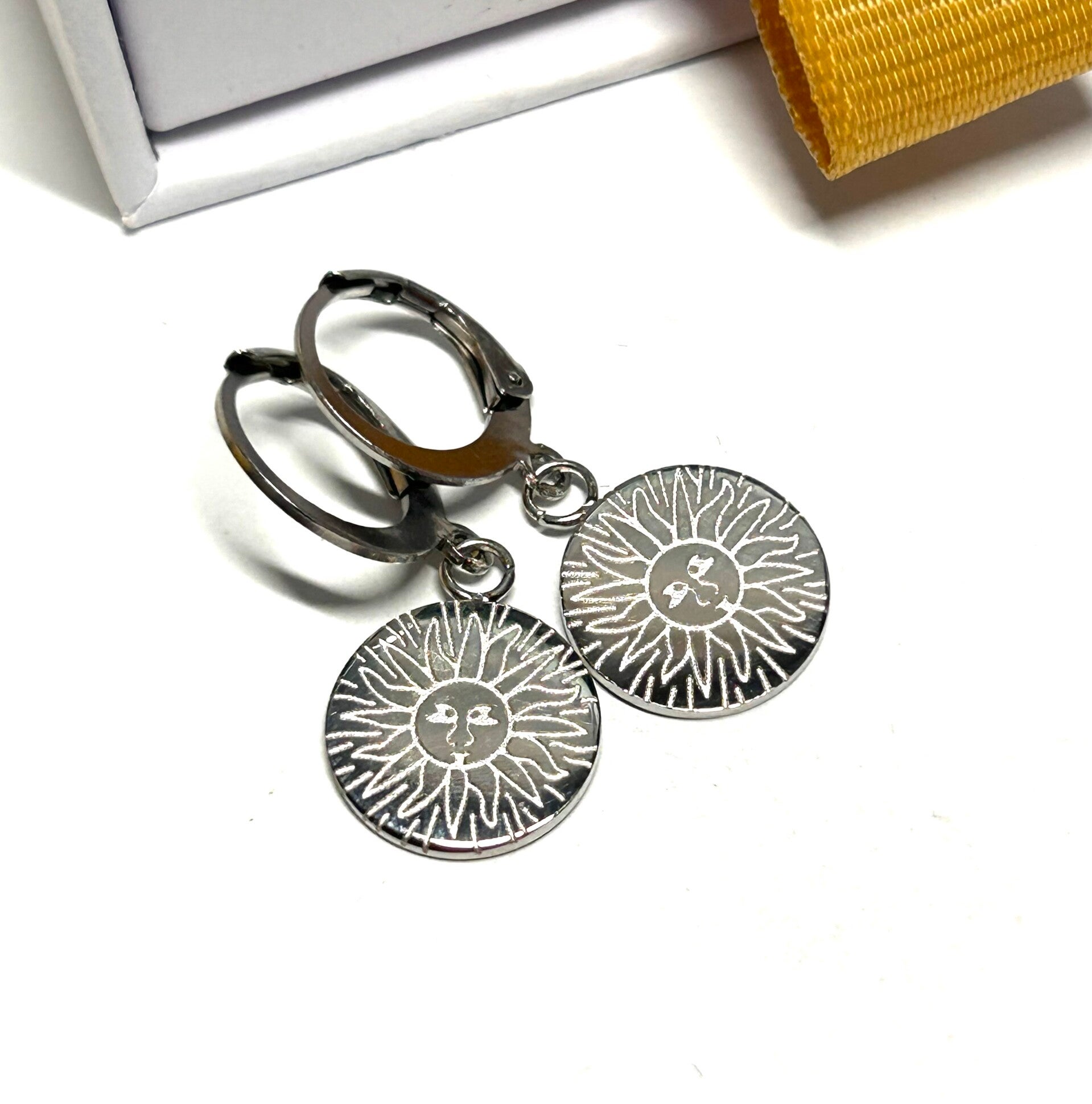 Ohrringe aus Edelstahl mit geprägten Sonnen Anhängern.