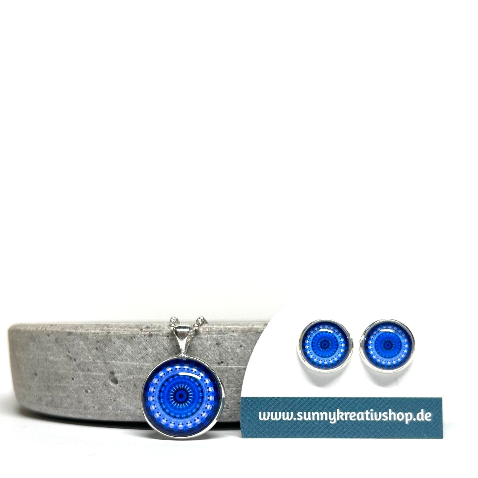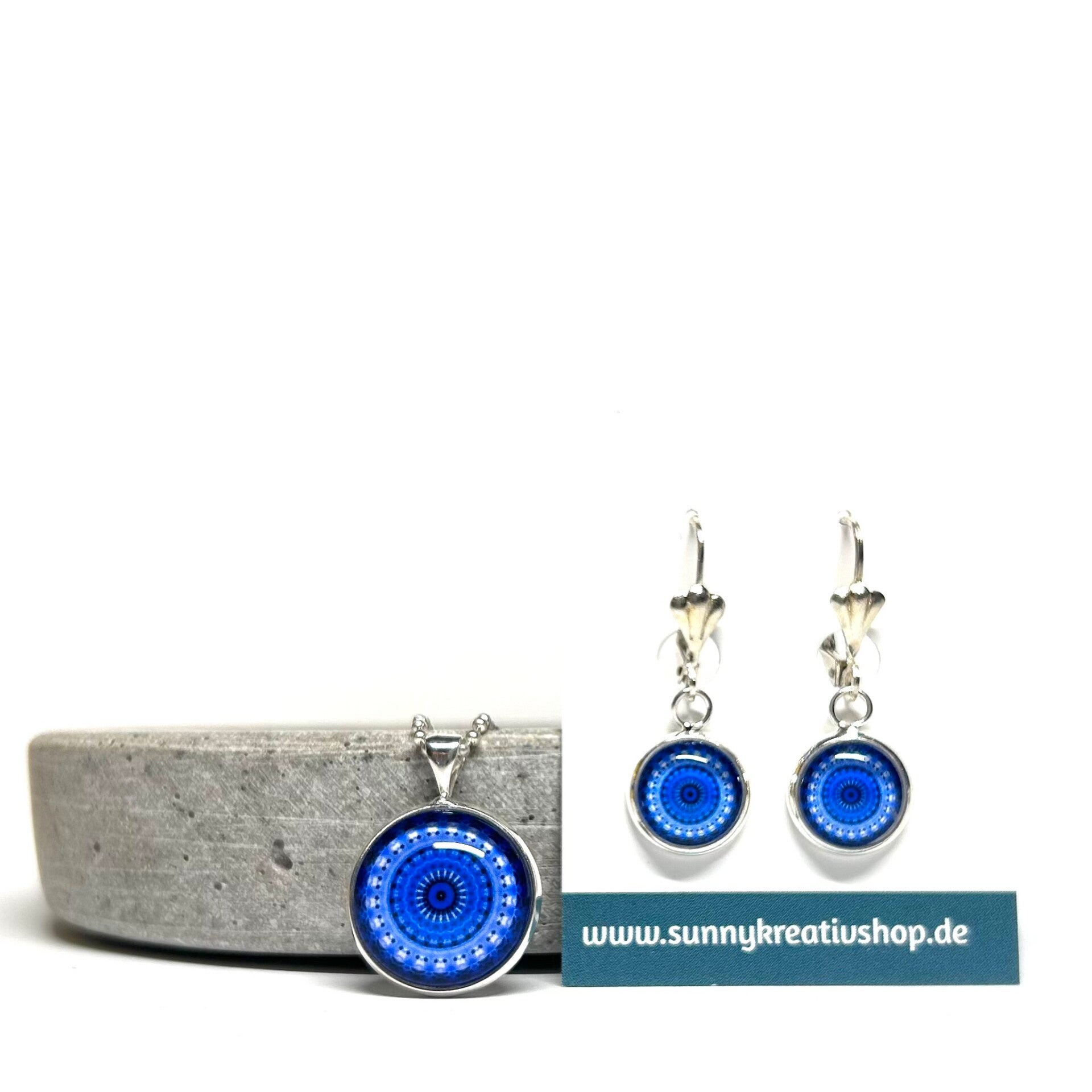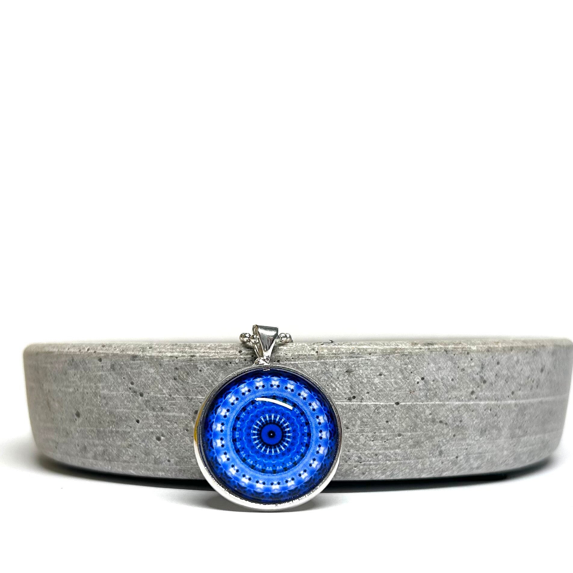 Mandala Blau/Hellblau Motiv in silberner Fassung.