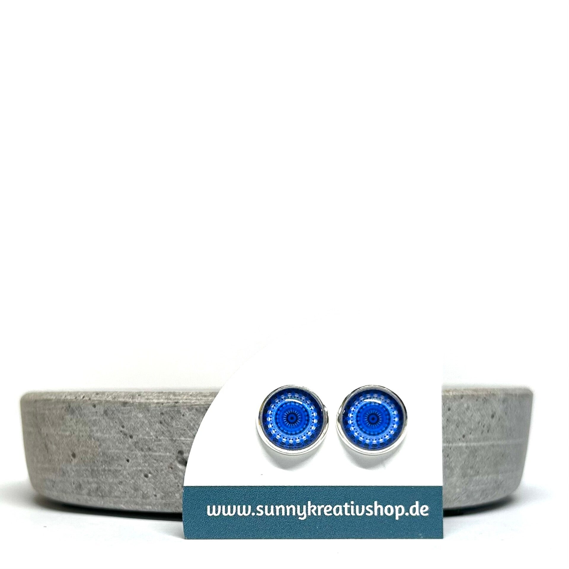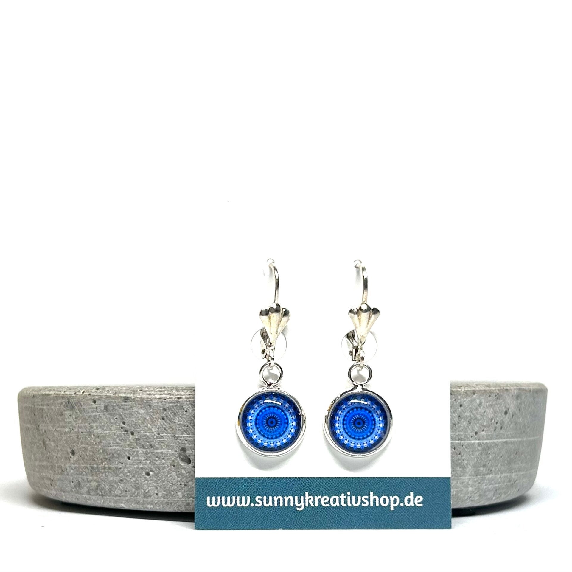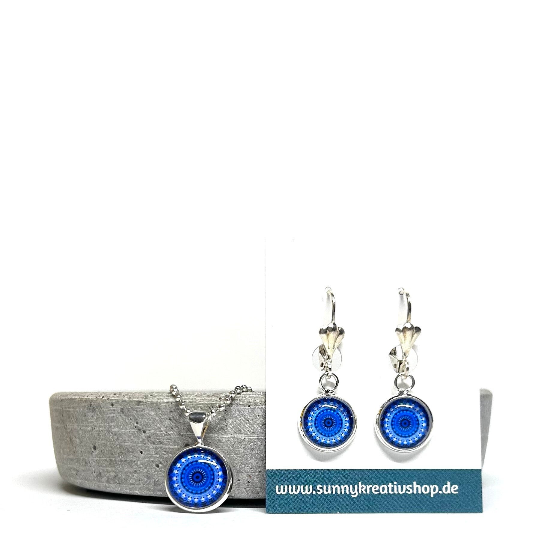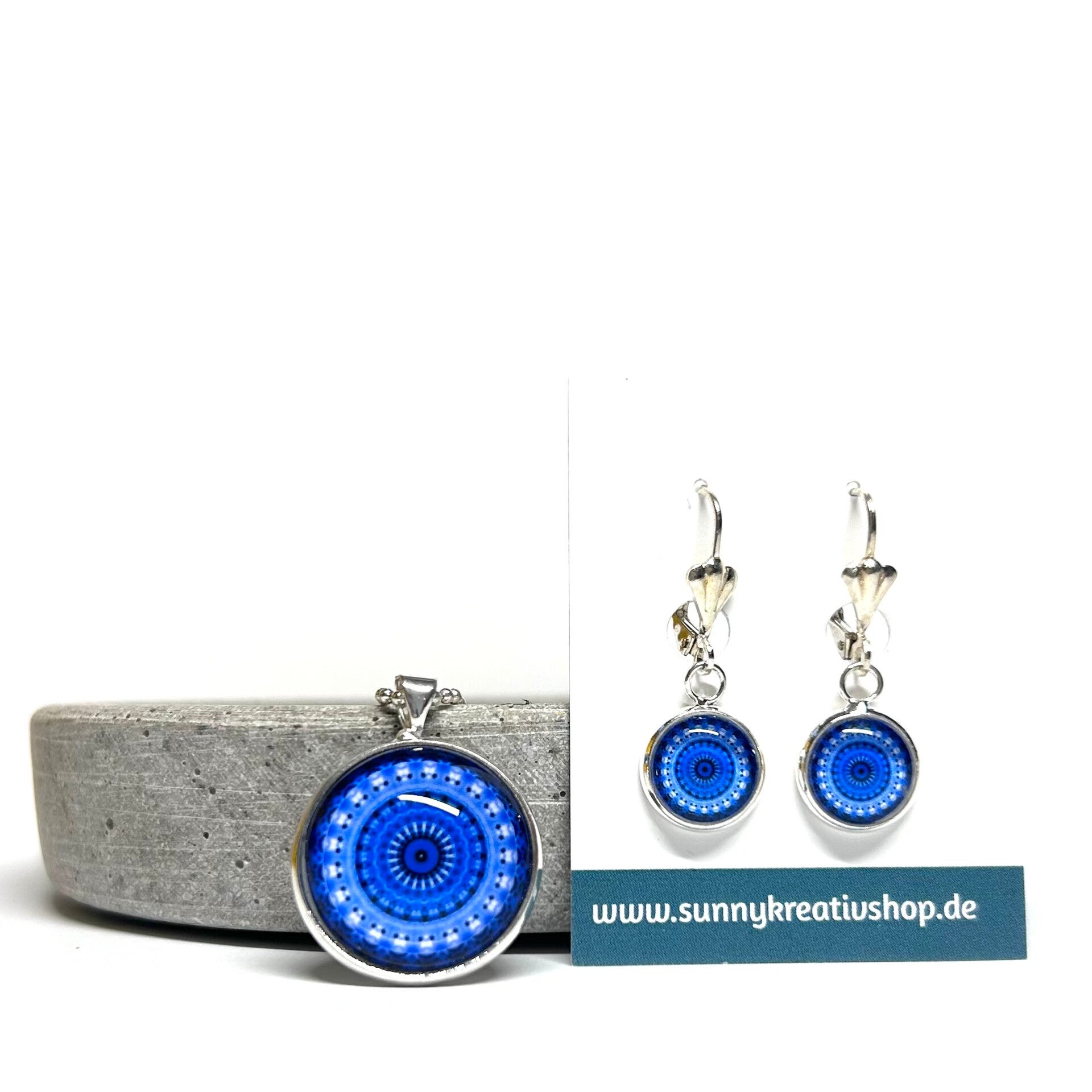 Mandala Blau/Hellblau Motiv in silberner Fassung.