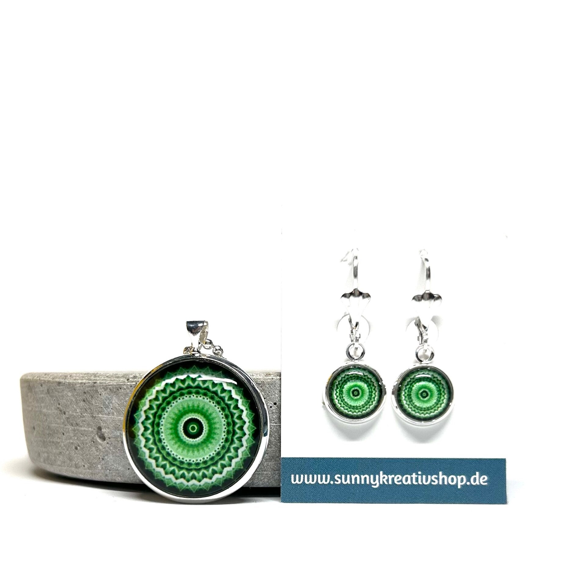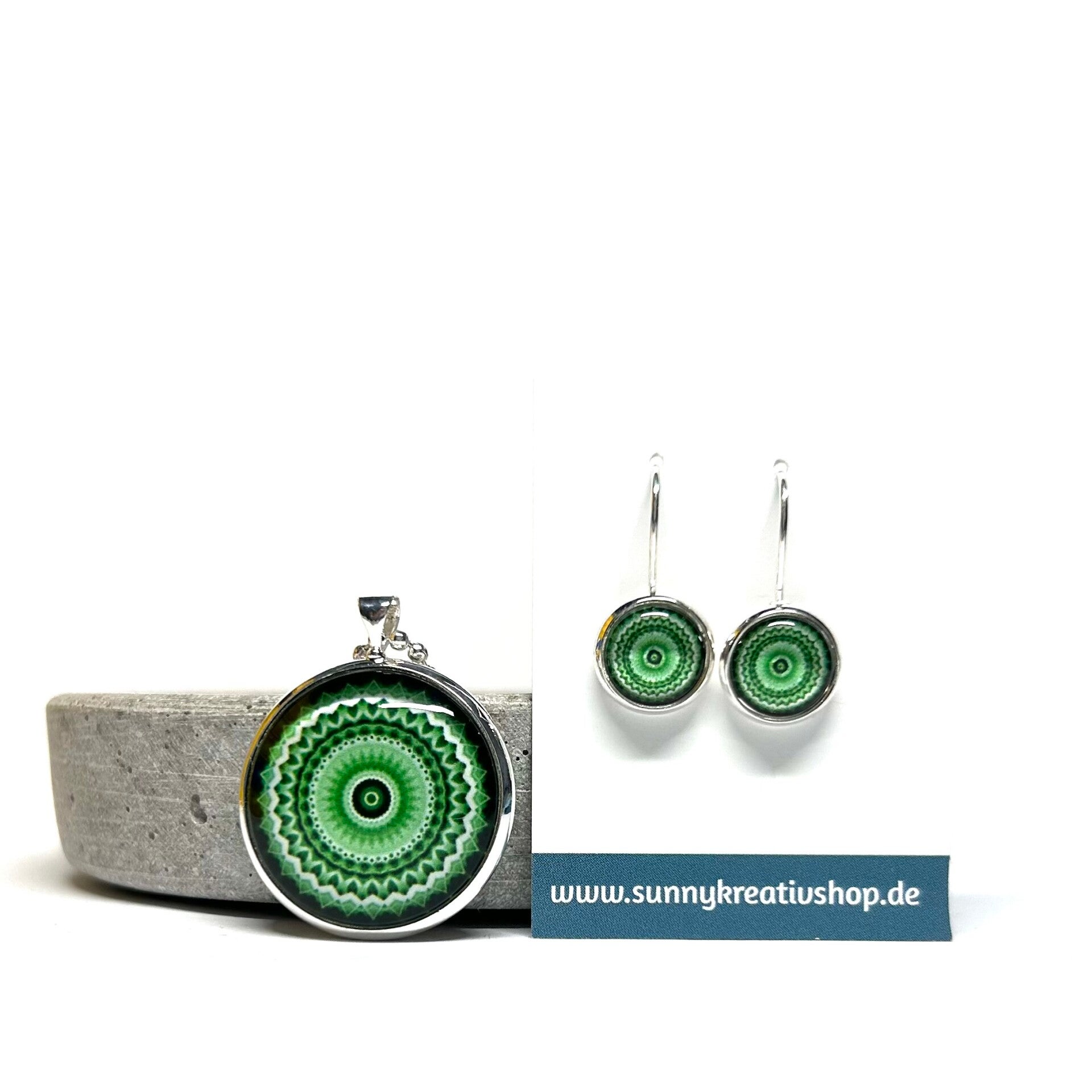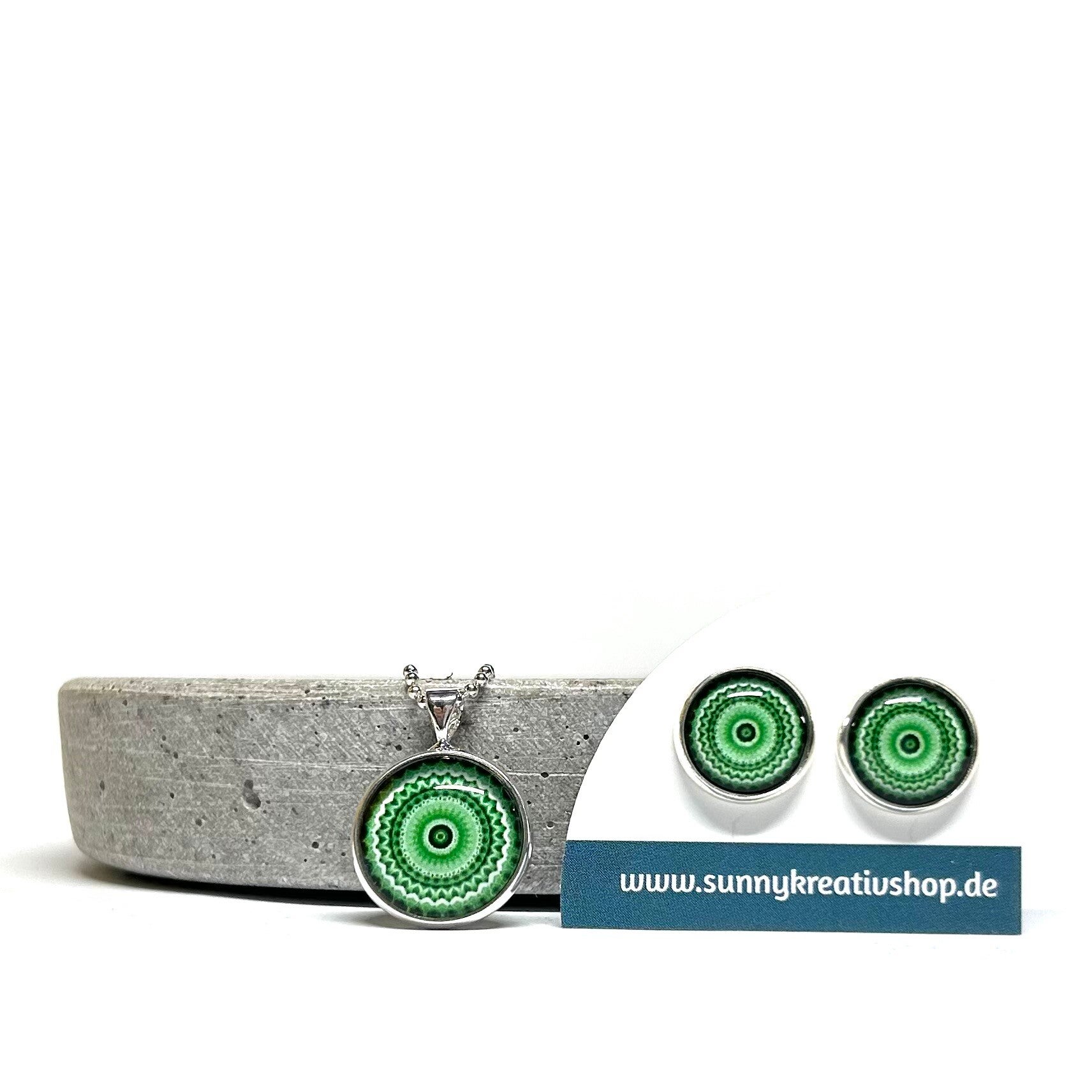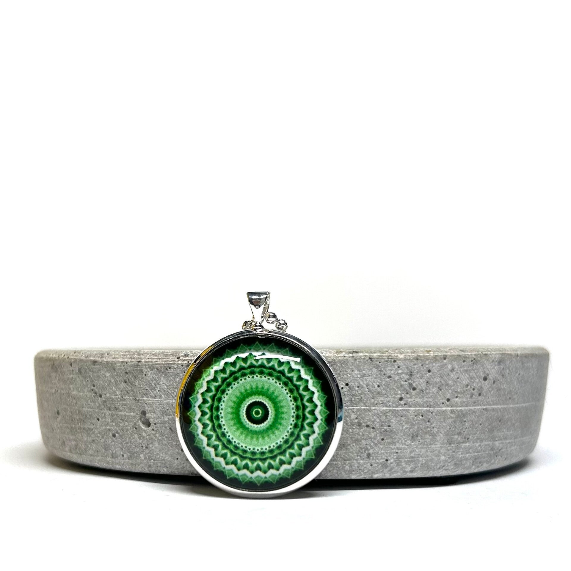 Mandala Grün/Schwarz/Weiß Motiv in silberner Fassung.