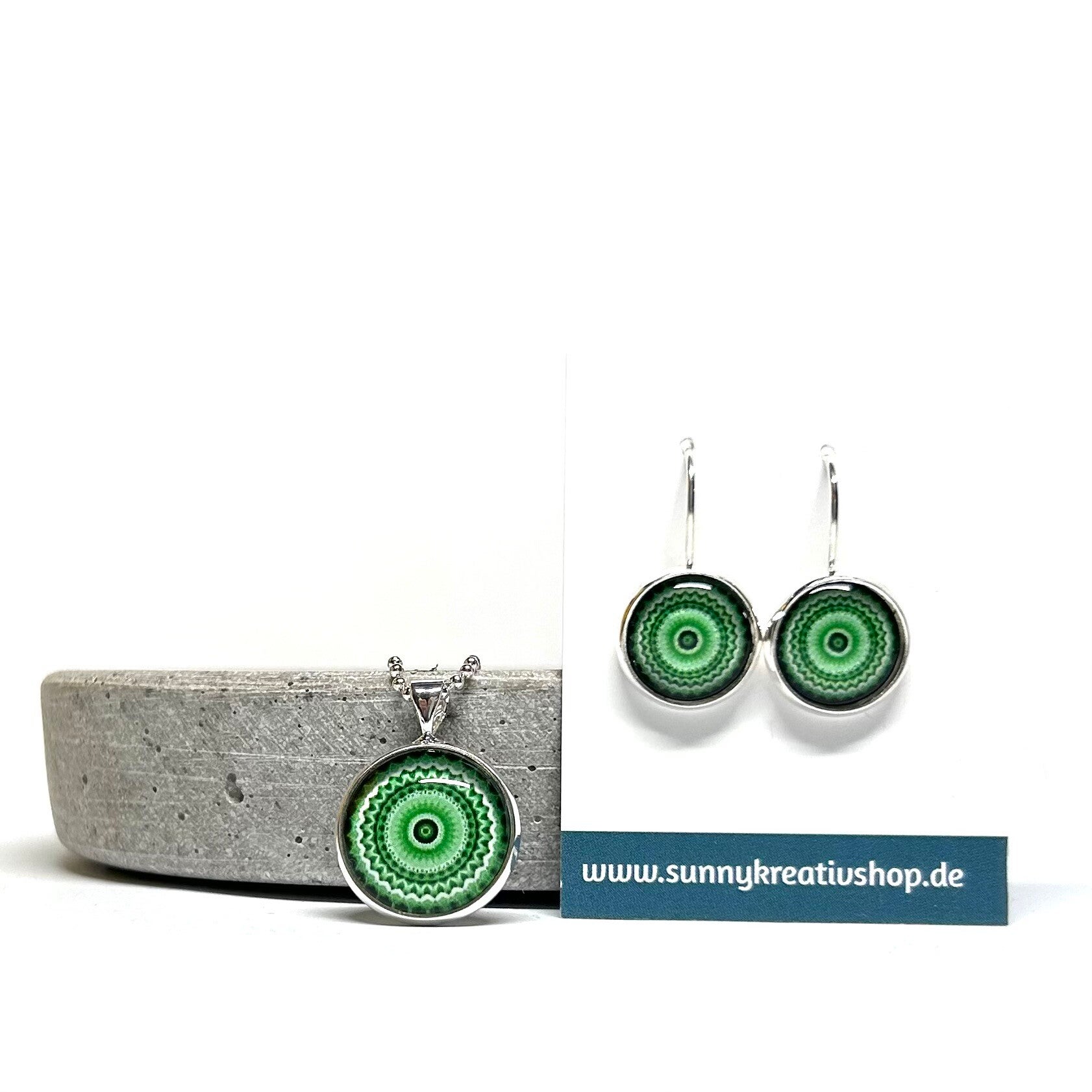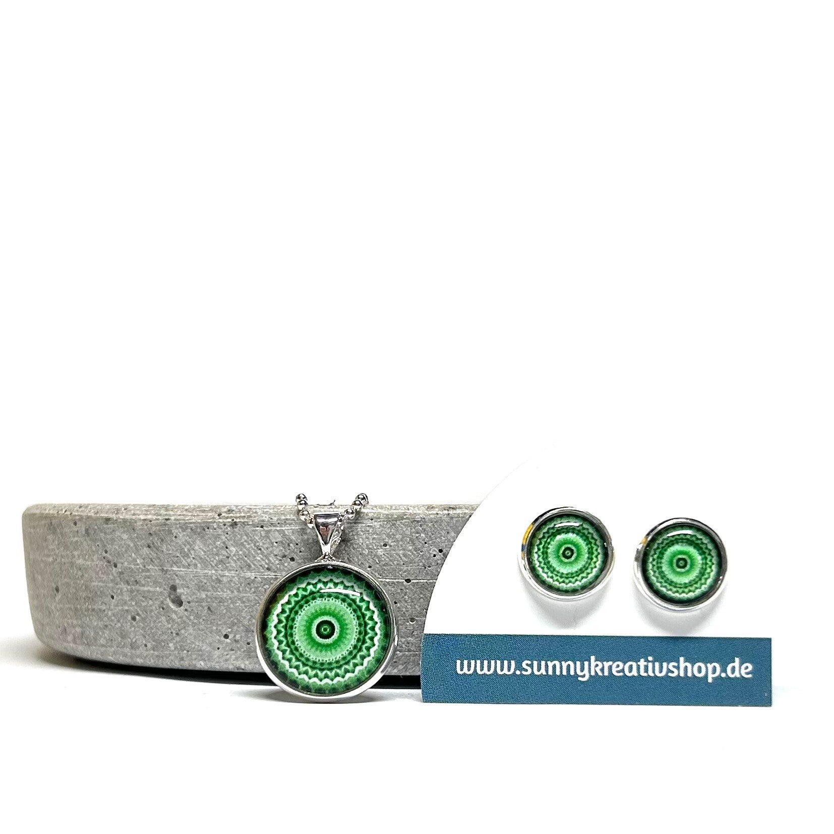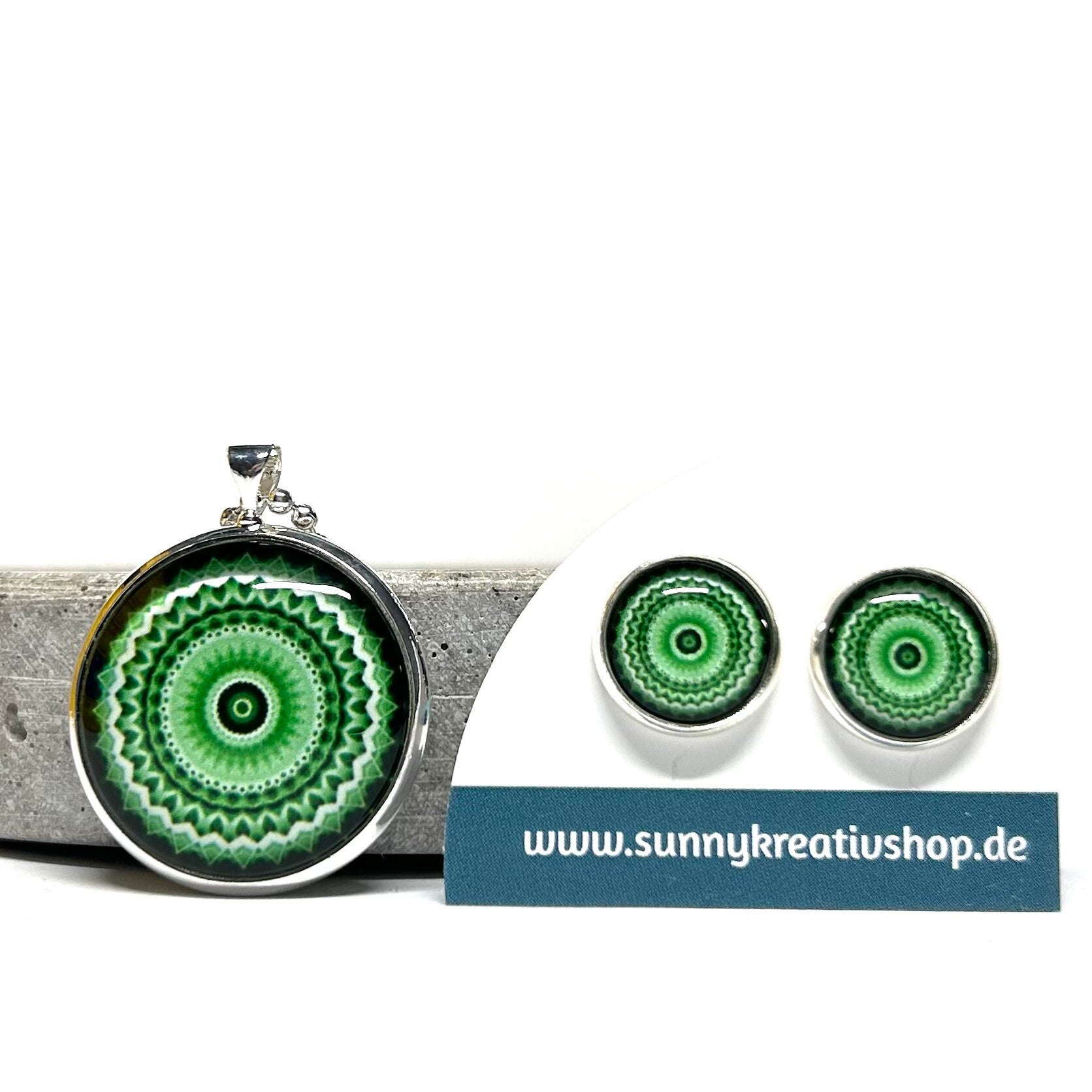Mandala Grün/Schwarz/Weiß Motiv in silberner Fassung.