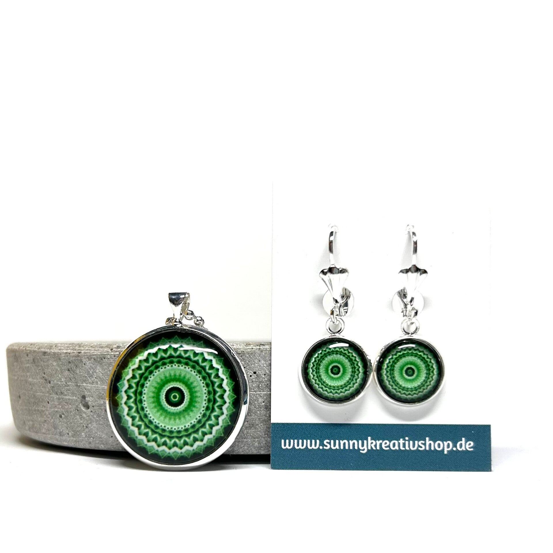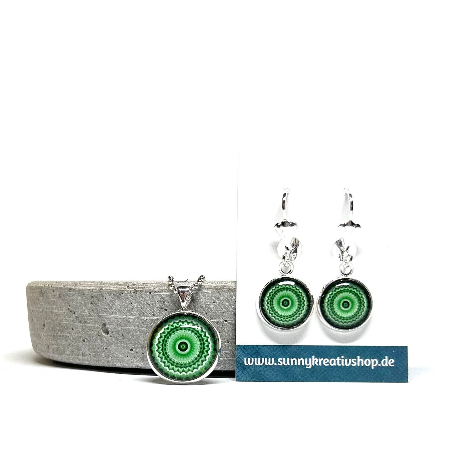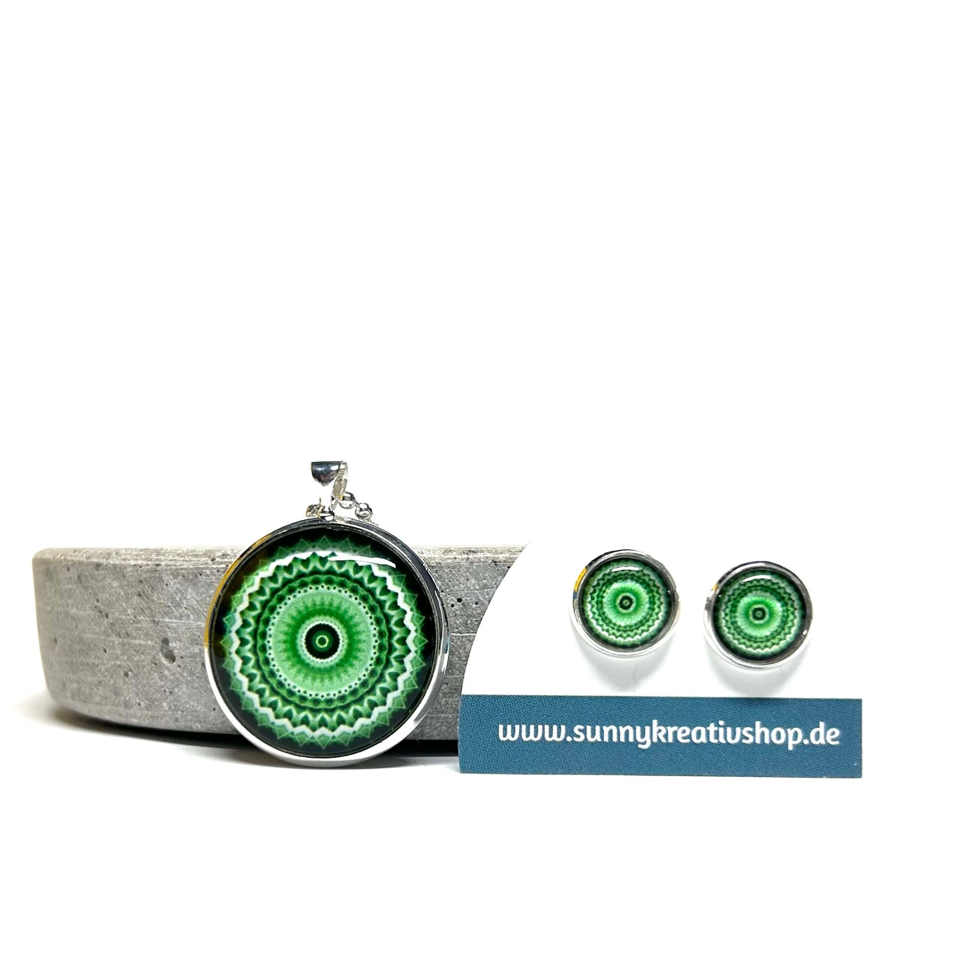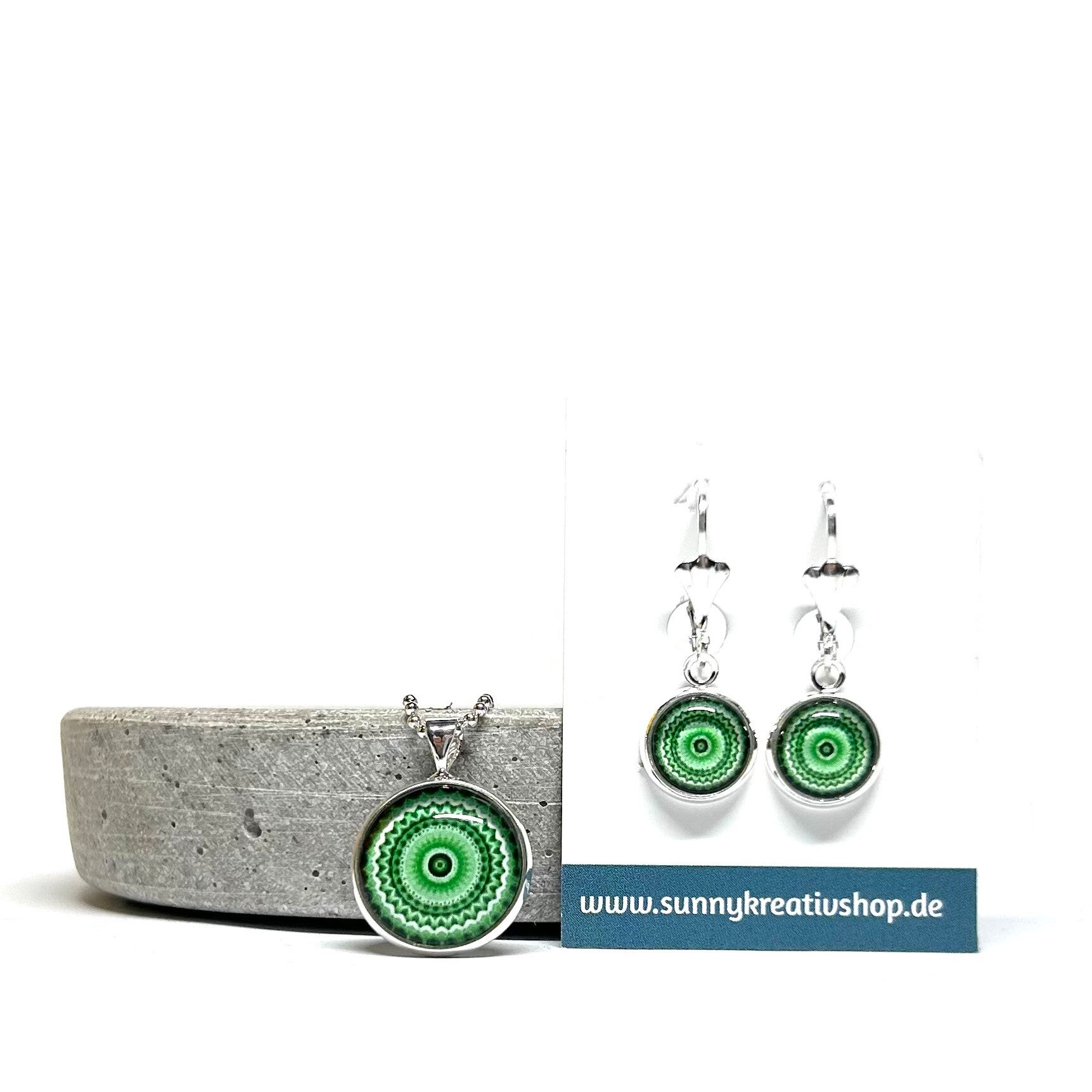 Mandala Grün/Schwarz/Weiß Motiv in silberner Fassung.