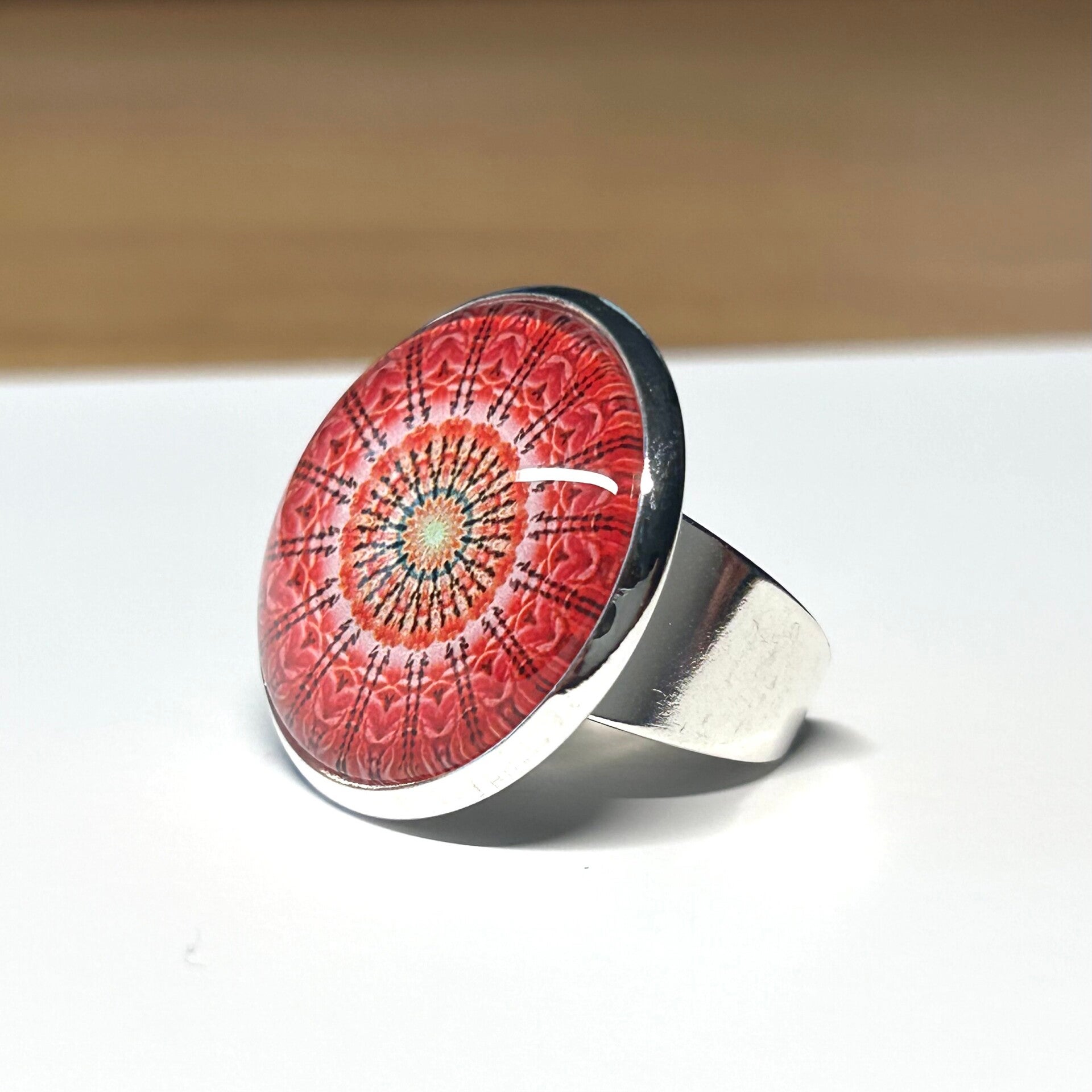 Ring mit 25mm Mandalamotiv in versilberter Fassung.