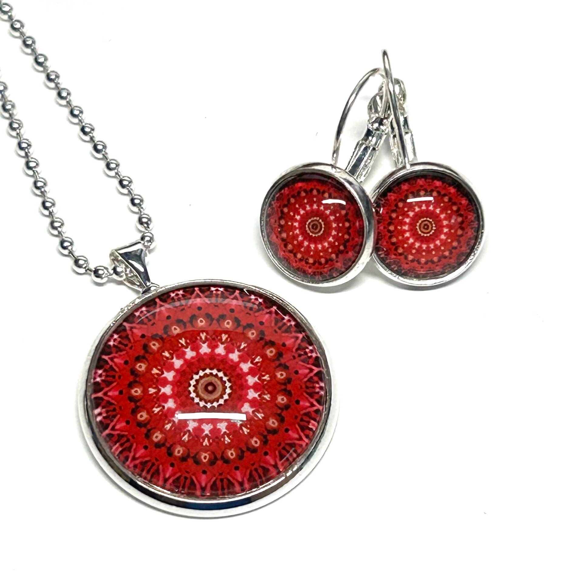 Schmuckset in silberfarbener Fassung mit Mandala Motiv.