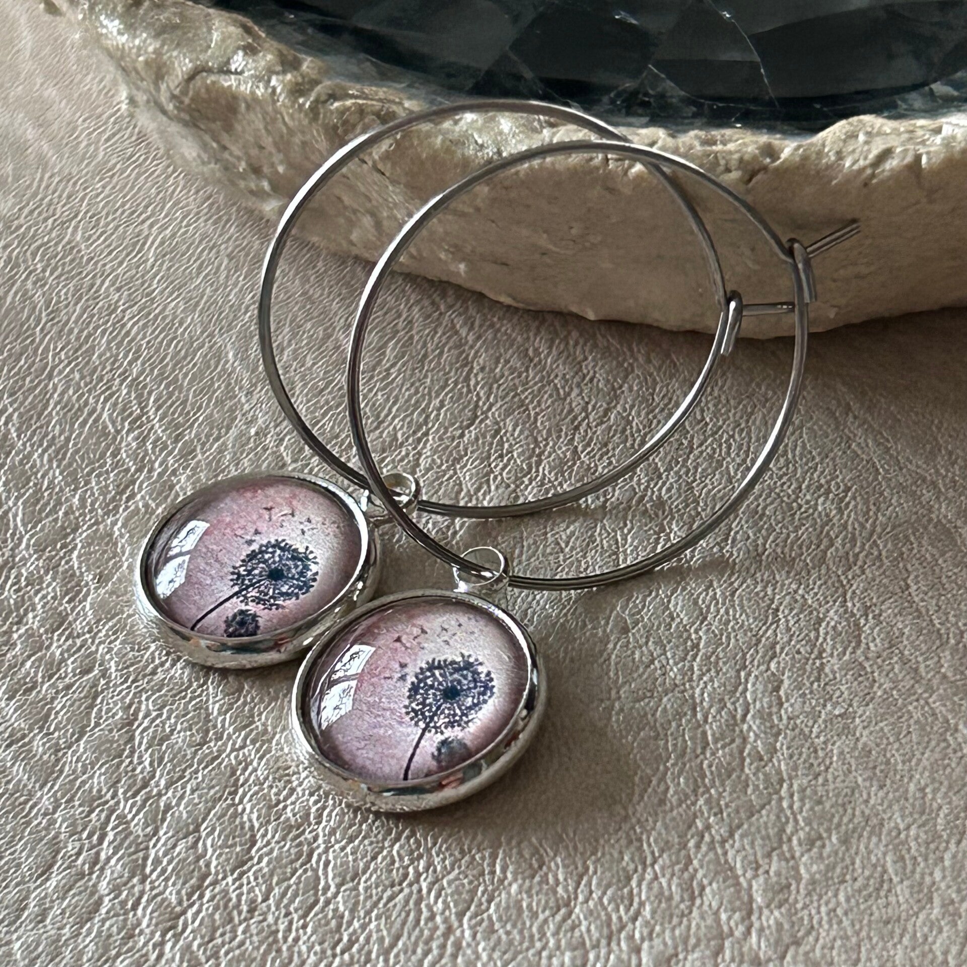 Ohrringe in Pastelltönen mit einem 12mm großem Pusteblume Motiv Glasstein.